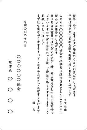 謹啓 時下ますますご隆盛のこととおび申し上げます 平素は格別のご高配を賜りく厚くお礼申し上げます さて 私儀 このたび○○○○○○協会の理事長に選任されましたことここに 謹んでご報告申し上げます 身にあまる重責ではごいますが精一杯の努力をしてまいる覚悟でございますので何卒倍旧のご支援ご鞭撻を賜りますようよろしく お願い申し上げます まずは略儀ながら書中をもってご報告かたがたご挨拶申し上げます 謹 白